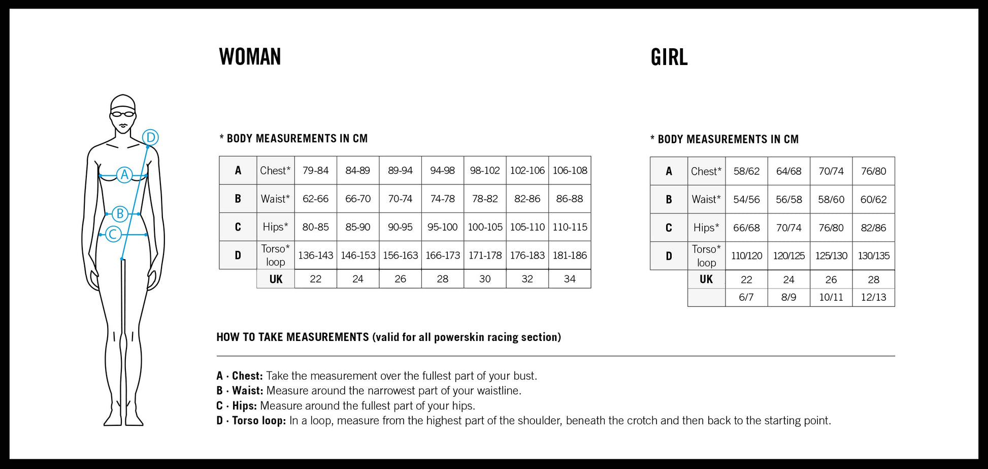 Je veľmi dôležité spraviť si presné telesné miery (obvod bokov, pásu, hrudníka a dĺžku trupu – tzv. „loop“) a vybrať veľkosť podľa oficiálnej veľkostnej tabuľky značky Arena.