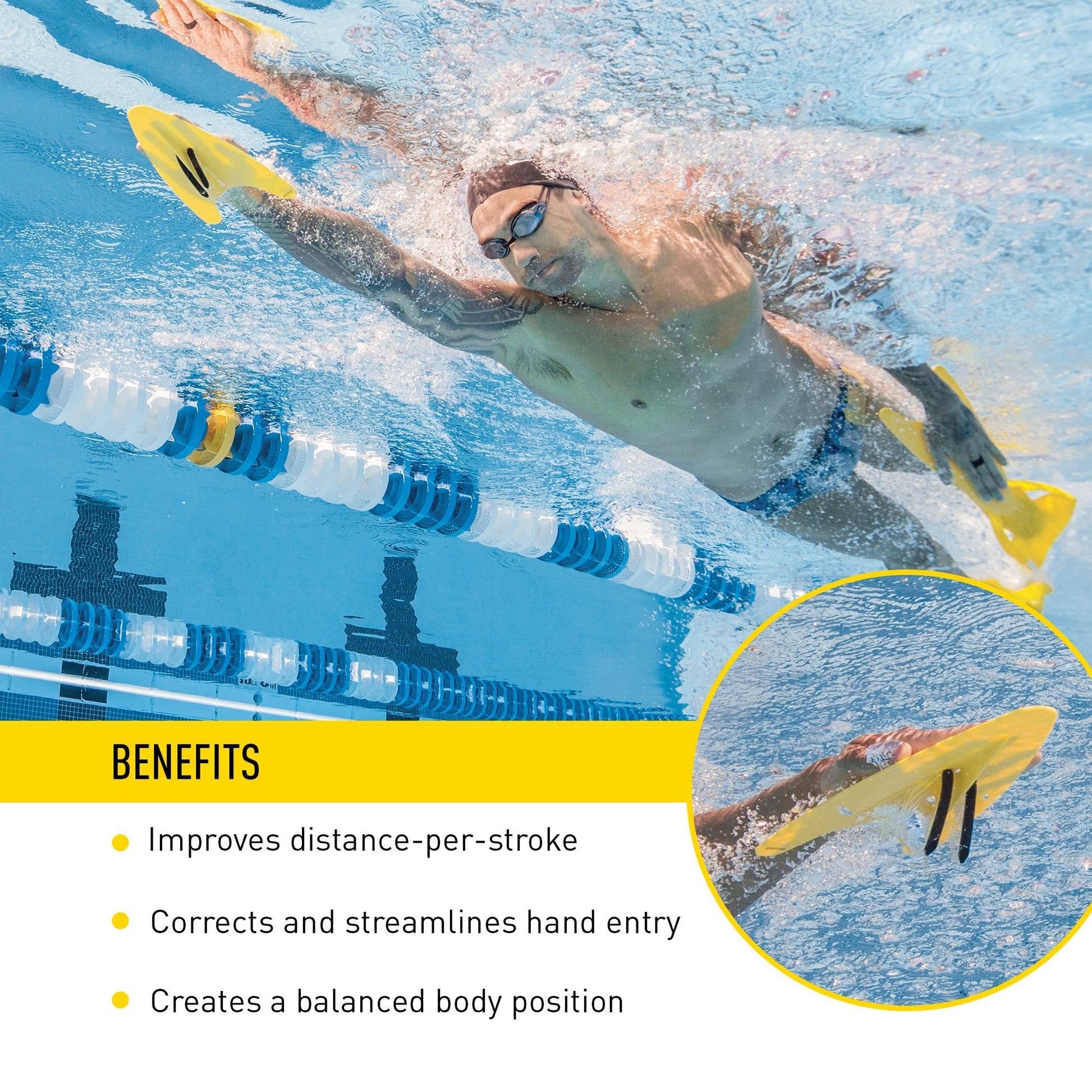 Specifically designed for freestyle training, the Freestyler Hand Paddles plane the hand forward through the water, improving reach and distance-per-stroke. With a long fin shape and unique skeg design, the Freestyler Hand Paddles promote a strong pull through, better hip-rotation and increased efficiency. An adjustable finger strap offers a perfect fit and the narrow surface area helps prevent shoulder strain.